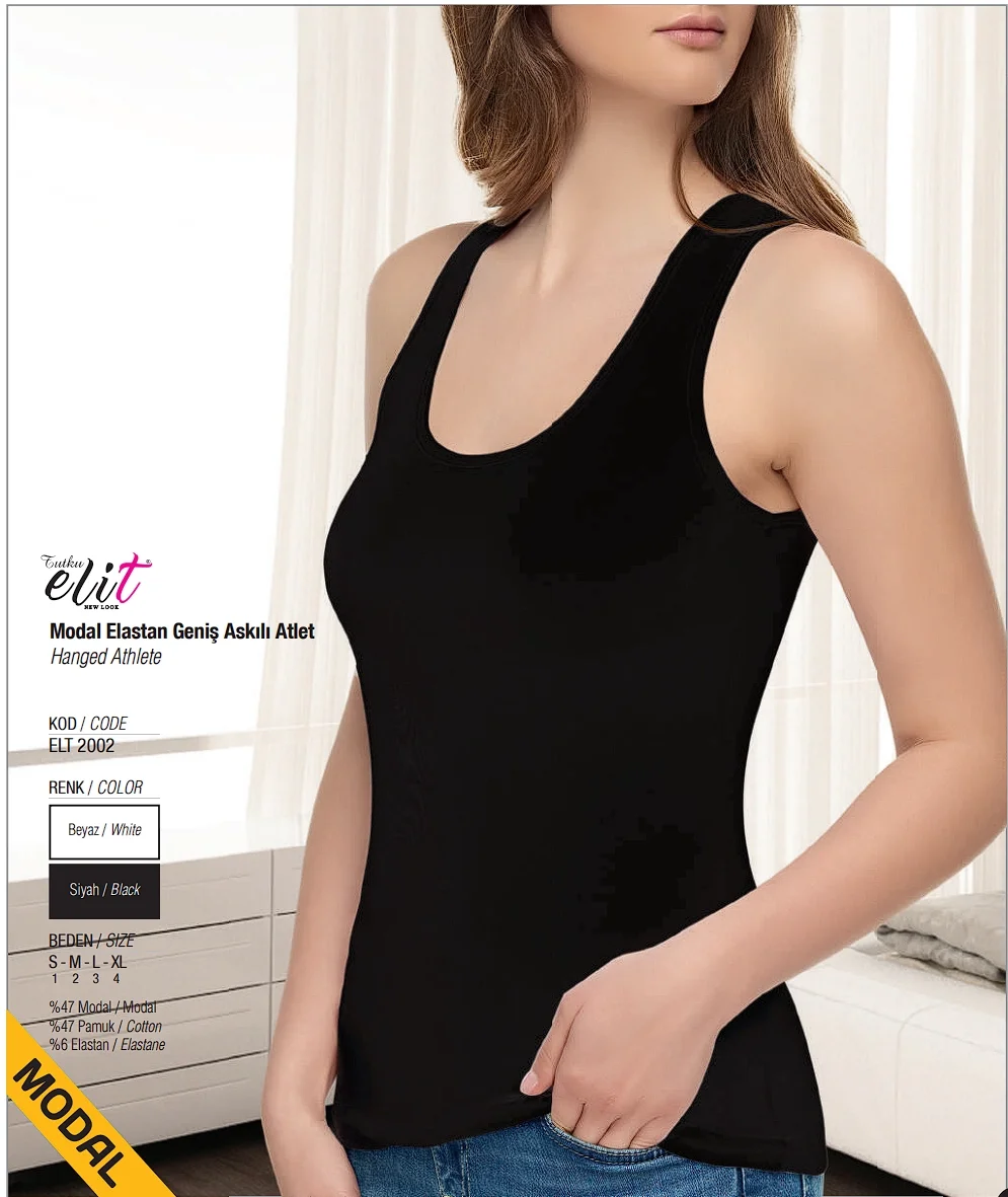 Tutku Elit 2002 Modal Elastan Bayan Geniş Askılı Atlet, kaliteli ve dayanıklı malzemelerden üretilmiştir. Modal ve pamuk karışımı sayesinde yumuşak dokusuyla cilde rahatlık sağlar. Esnek elastan içeriği ise hareket özgürlüğü sunar.