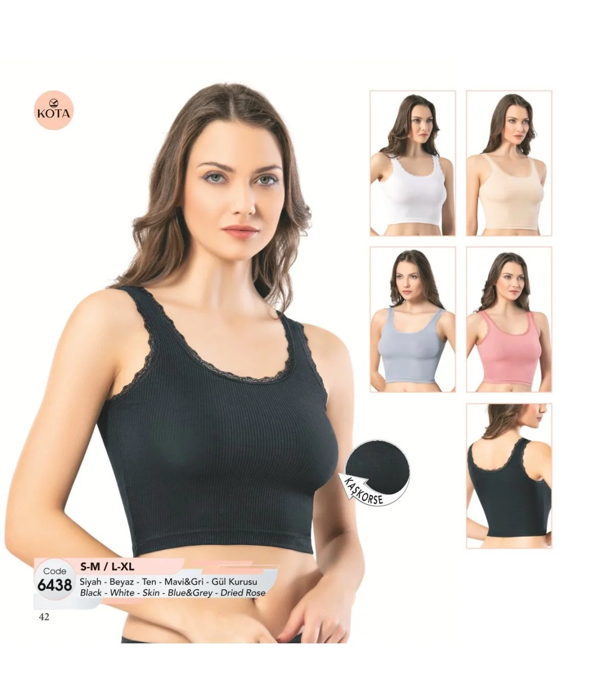 Kota Bayan Kaşkorse Tırnak Dantelli Geniş Askılı Krop, farklı renklerde ve çeşitli bedenlerde sunulmaktadır. Sitemizdeki ürün sayfalarında bulunan ölçü tablolarını inceleyerek doğru seçimi yapabilirsiniz. İhtiyacınıza en uygun iç giyim ürünlerini seçmek için hemen tıklayın! Wakor Toptan İç Giyim Ürünleri - En Trend Renk ve Beden Seçenekleriyle.