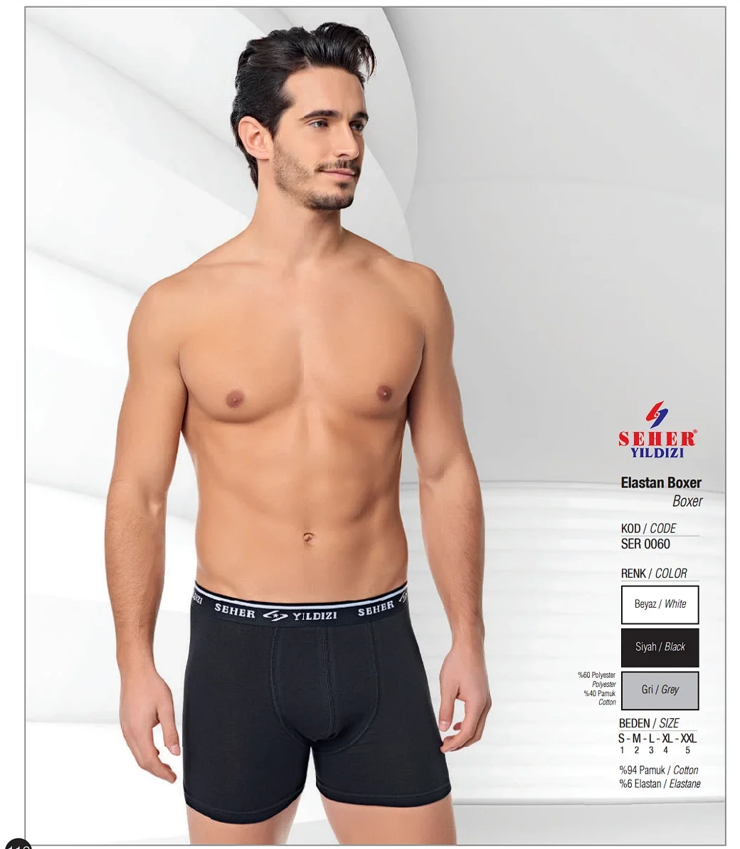 Wakor Toptan, iç giyimde kaliteyi ve şıklığı bir araya getiriyor! Seher Erkek Elastan Boxer koleksiyonumuzla her tarza uygun iç giyim seçeneklerini keşfedin. Ürünlerimizde çeşitli renk ve beden seçenekleri mevcuttur, böylece tam size uygun olanı bulabilirsiniz.