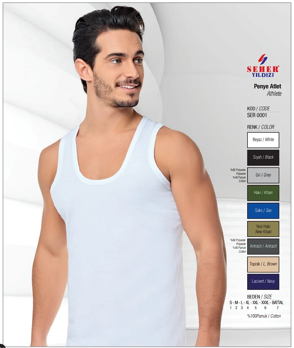Seher Erkek Penye Atlet, %100 pamuk kullanılarak üretilmiş beyaz atlet setidir. Bu atlet, yüksek kaliteli pamuk malzemesiyle üretilmiştir ve konforlu bir kullanım sağlar.