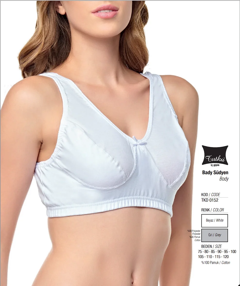 Tutku Bayan Bady Sütyen, %100 pamuklu kumaşıyla konfor ve şıklığı bir araya getiriyor. Ürün, beyaz, gri ve siyah renk seçenekleri ile ve 75-120 beden aralığında sunulmaktadır.