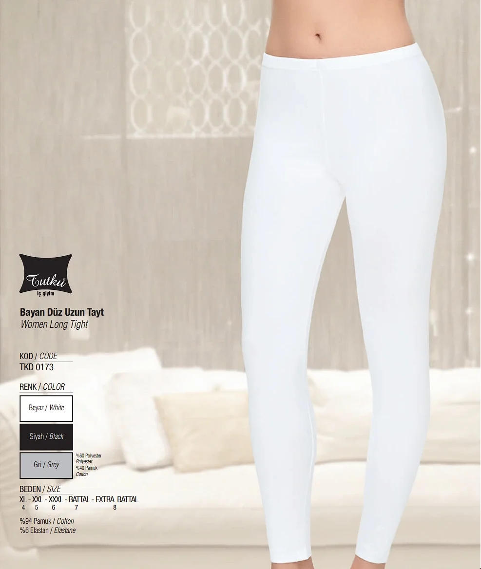 Tutku Bayan Uzun Düz Tayt, %60 Polyester ve %34 Pamuk içeren Siyah renk seçeneğiyle ve %94 Pamuk ile %6 Elastan karışımından oluşan Beyaz renk seçeneğiyle sunulmaktadır.