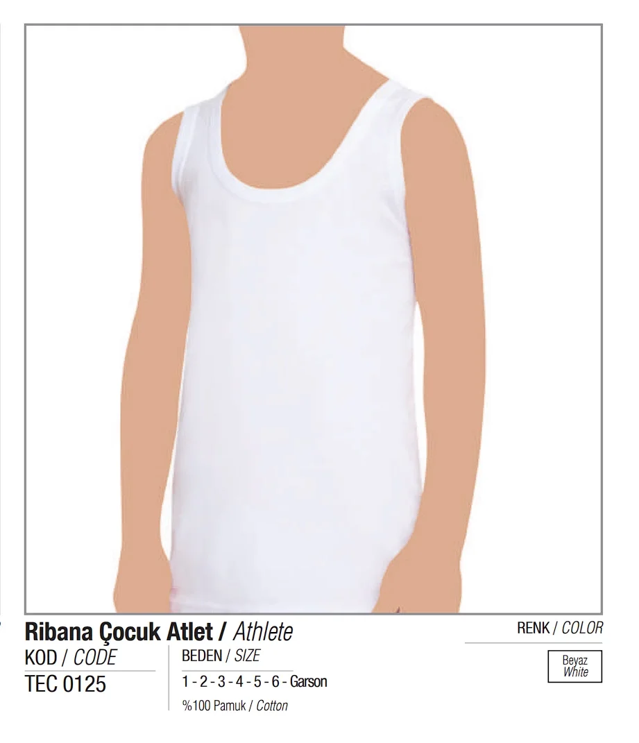 Tutku Çocuk Ribana Atlet, farklı renklerde ve çeşitli bedenlerde sunulmaktadır. Sitemizdeki ürün sayfalarında bulunan ölçü tablolarını inceleyerek doğru seçimi yapabilirsiniz. İhtiyacınıza en uygun iç giyim ürünlerini seçmek için hemen tıklayın! Wakor Toptan İç Giyim Ürünleri - En Trend Renk ve Beden Seçenekleriyle.