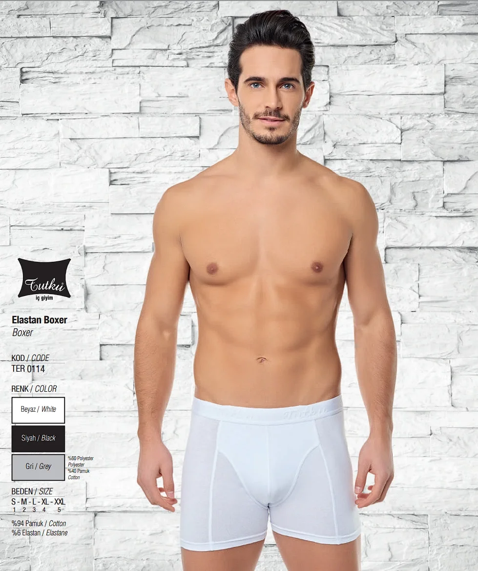 Tutku Erkek Elastan Boxer, %96 pamuk ve %4 elastan karışımıyla üretilen rahat iç çamaşırı. Beyaz, gri ve siyah renk seçenekleriyle S, M, L, XL, XXL bedenleri mevcut. Hemen satın alın!