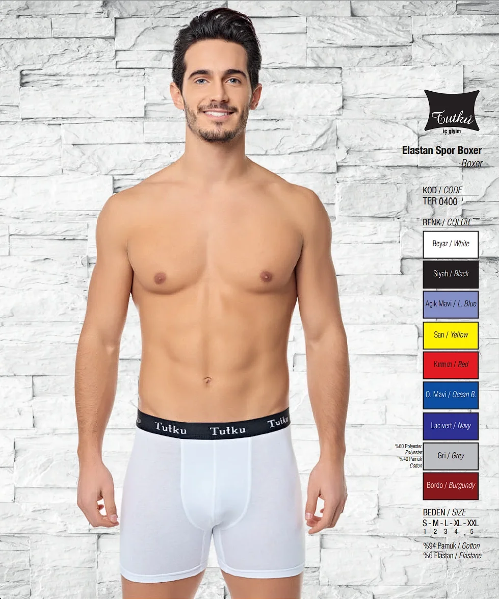 Tutku Erkek Elastan Spor Boxer %94 pamuk ve %6 elastan malzemesiyle üretilmiştir. Beyaz, Sarı, Kırmızı, Gri, Antrasit, Siyah, Şampanya, Havacı Mavi, Bordo, Okyanus Mavi, Lacivert ve Füme renk seçenekleri ile S, M, L, XL ve XXL beden seçenekleri mevcuttur.