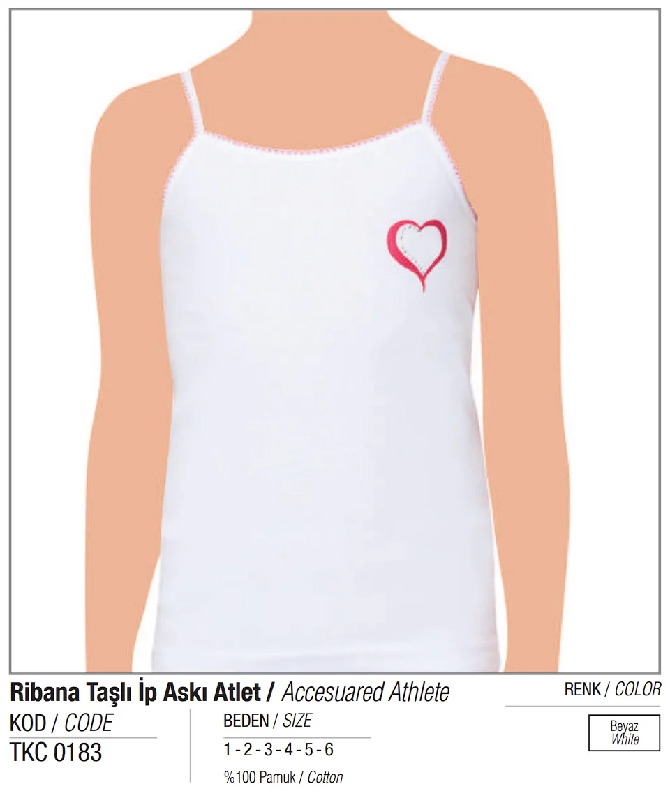 Tutku Kız taşlı ribana ip askılı atlet, yaz aylarında %100 pamuk malzeme ile üretilmiş şıklığı ve rahatlığı bir arada sunar.